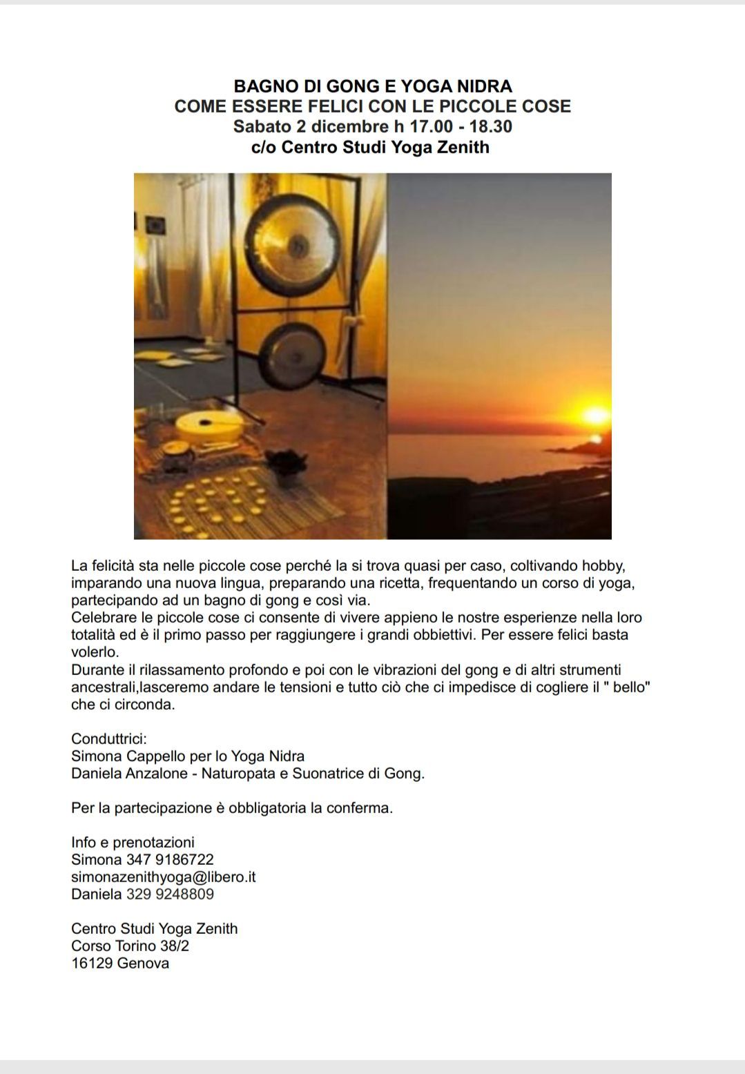Sabato 29 novembre h 17.00 -18.30 c/o Centro Studi Yoga Zenith Corso Torino 38/2 16129 Genova