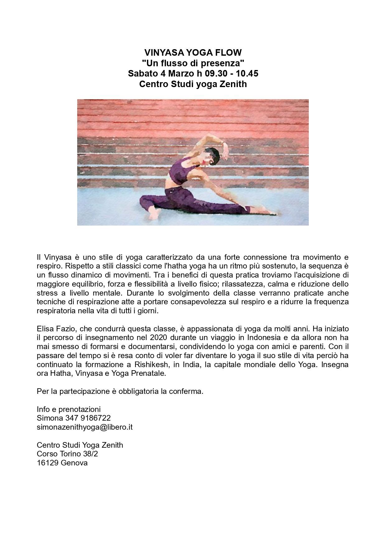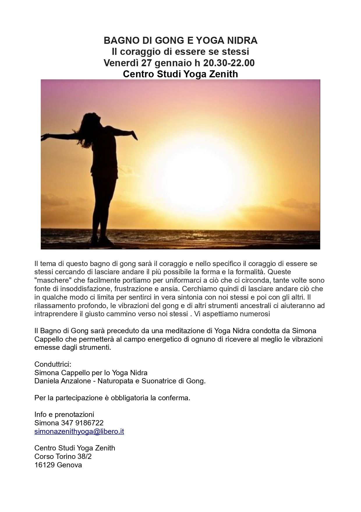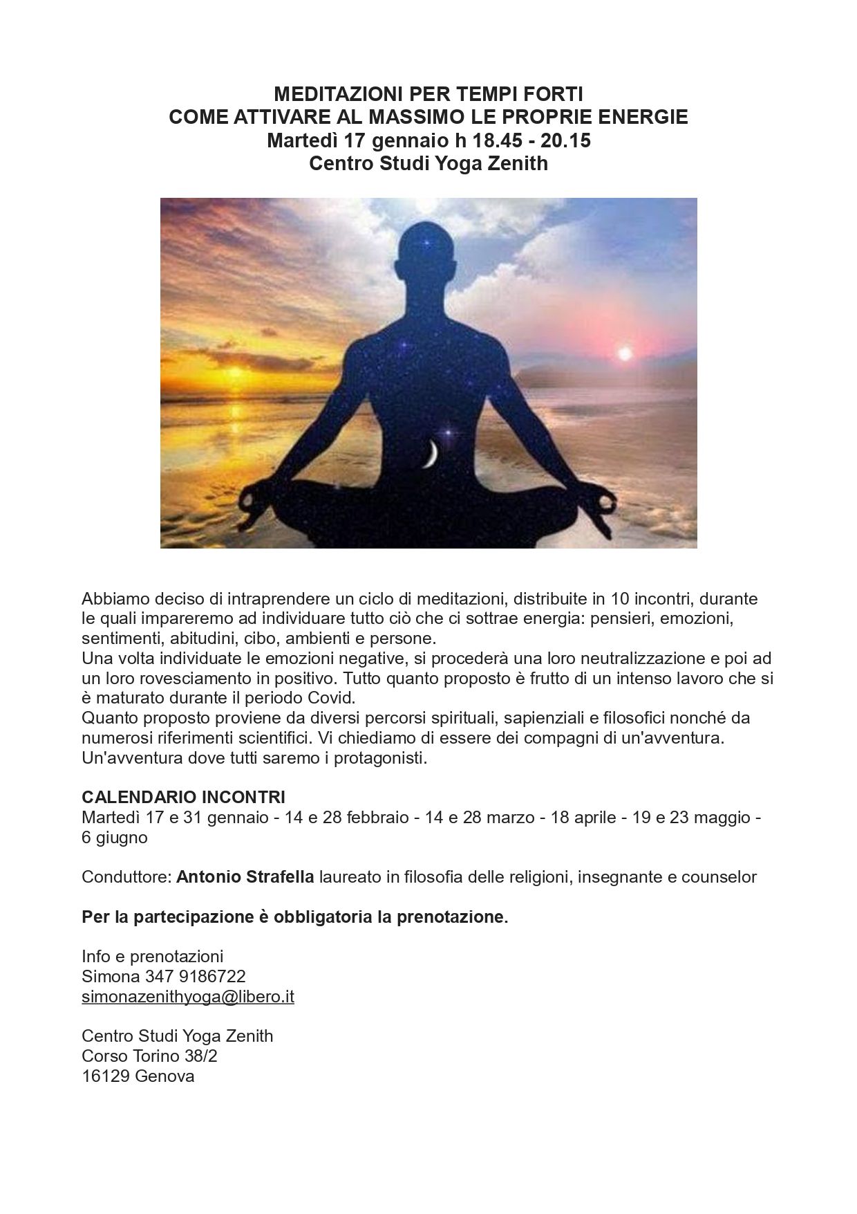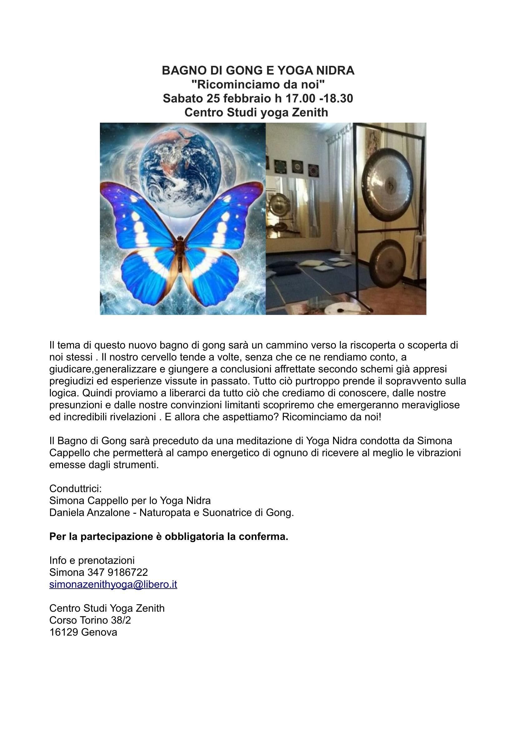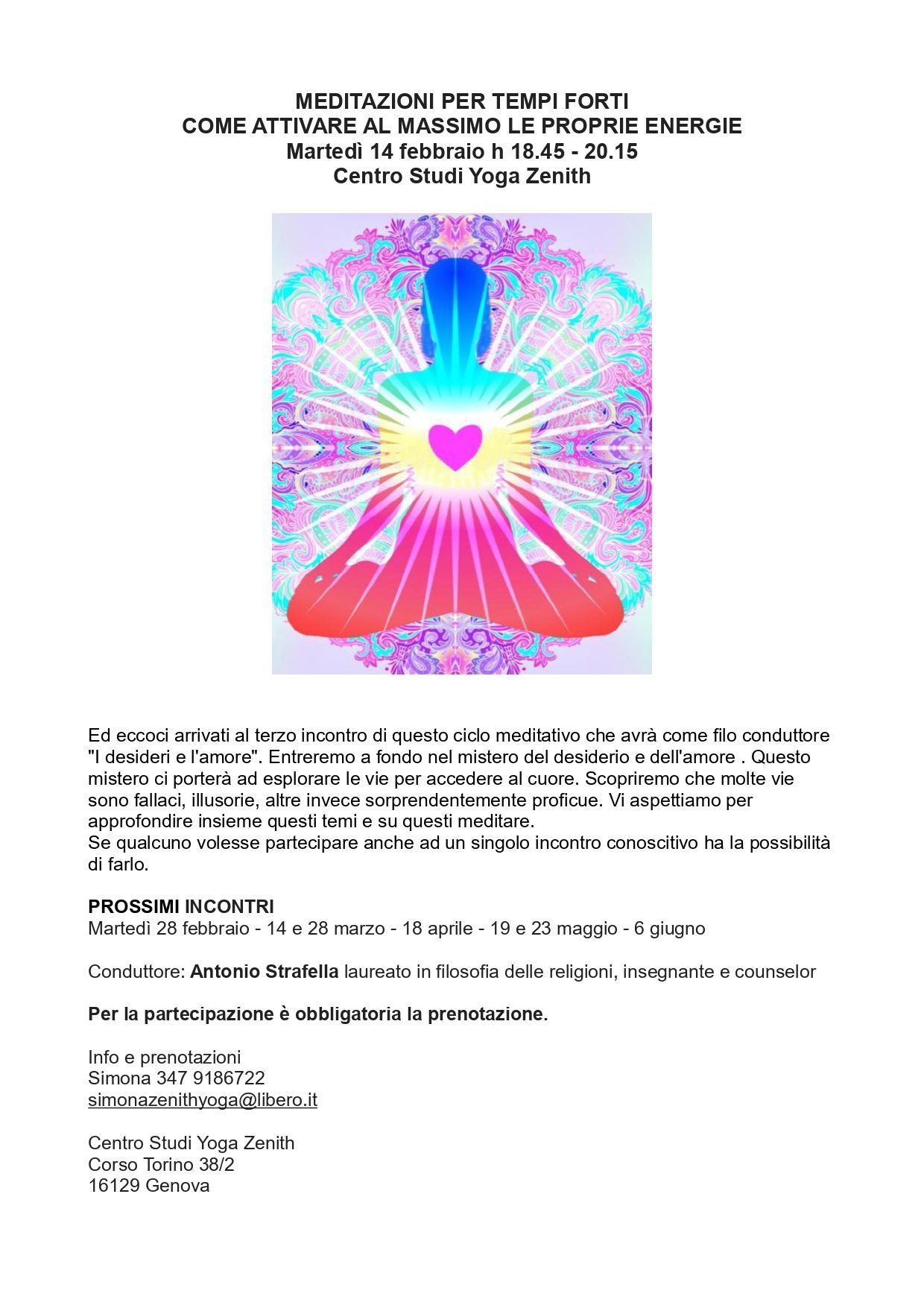 Sabato 31 gennaio h 17.30-19.00 c/o Centro Studi Yoga Zenith Corso Torino 38/2 16129 Genova