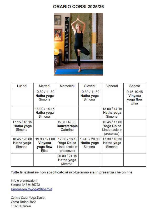 Il Centro Studi Yoga Zenith, a Genova, svolge corsi di varie discipline, tra cui: Yoga, meditazione, Tai Ji Quan, Qi Gong e ginnastica posturale. Tutte le lezioni organizzate dal centro, possono essere svolte in gruppo o in maniera individuale, anche online sulla piattaforma Zoom. Inoltre, i corsi sono adatti a tutti e vengono sviluppati percorsi speciali su misura per persone con particolari difficoltà fisiche.